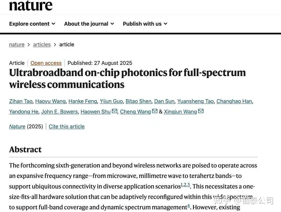 该芯片基于先进的薄膜铌酸锂光子材料平台,成功实现了宽带无线与光信号转换、低噪声载波本振信号协调、数字基带调制等多项关键功能。实验验证表明,基于芯片的创新系统可实现超120Gbps的超高速无线传输速率,完全满足6G通信峰值速率的要求,同时端到端无线通信链路在全频段内表现出一致的优异性能,高频段性能亦未出现劣化。这一成果为6G通信在太赫兹乃至更高频段频谱资源的高效开发扫清了技术障碍。