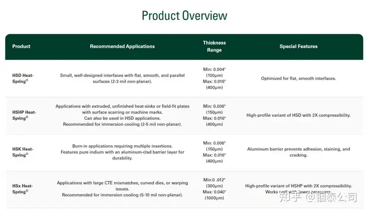 以下为Heat-Spring®导热界面材料的相关产品规格,适用于不同工艺需求,如需进一步专业支持,欢迎点击文末“阅读原文“联系我们。