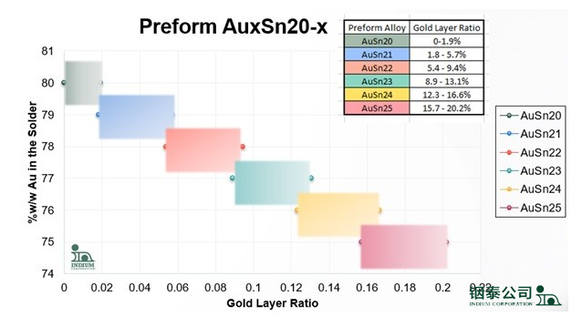 铟泰公司可以提供AuLTRA®75、AuLTRA®76、AuLTRA®77、AuLTRA®78、AuLTRA®79等多种金锡合金配比合金,可以按照芯片尺寸订制焊片和焊带,最薄可至0.0035英寸(0.00889mm),以满足不同的应用需要。想要咨询产品、技术信息,请点击左下角“阅读原文”联系我们。
