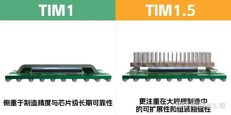 TIM1.5指芯片与散热器之间的界面材料。它同样用于芯片级散热,但在制造流程中引入较晚,承担着连接封装与系统级冷却方案的桥梁作用。