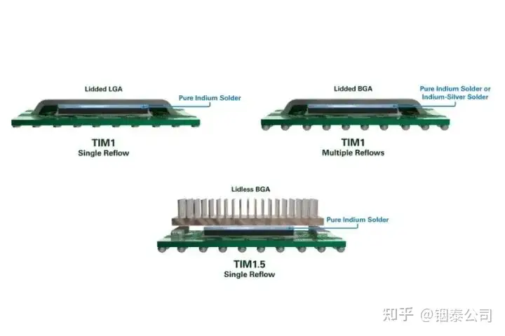 在高功率密度组件中,TIM1和TIM1.5应用中最常用的金属是纯铟和铟基合金。这类材料凭借其卓越的导热性能、低热阻以及优异的长期可靠性,能与大面积、易翘曲的表面形成牢固的机械结合。针对这两种应用,采用焊接型导热界面材料均需在硅芯片背面以及散热盖或散热器焊接面进行金属化处理。